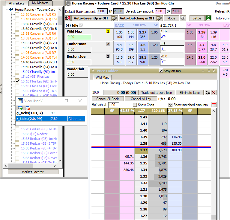 Let’s not forget that these markets feature the probability of two (three, four, etc.) horses taking the winning places together. E.g. the screenshot shows a market with three winning places, therefore if you add up the chances of individual horses (100 divided by their price), you should get a result of around 300%.