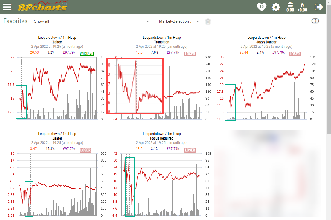 Let’s look at BFCharts graphs to see what happens to horses’ prices when one of them is withdrawn from a race.
