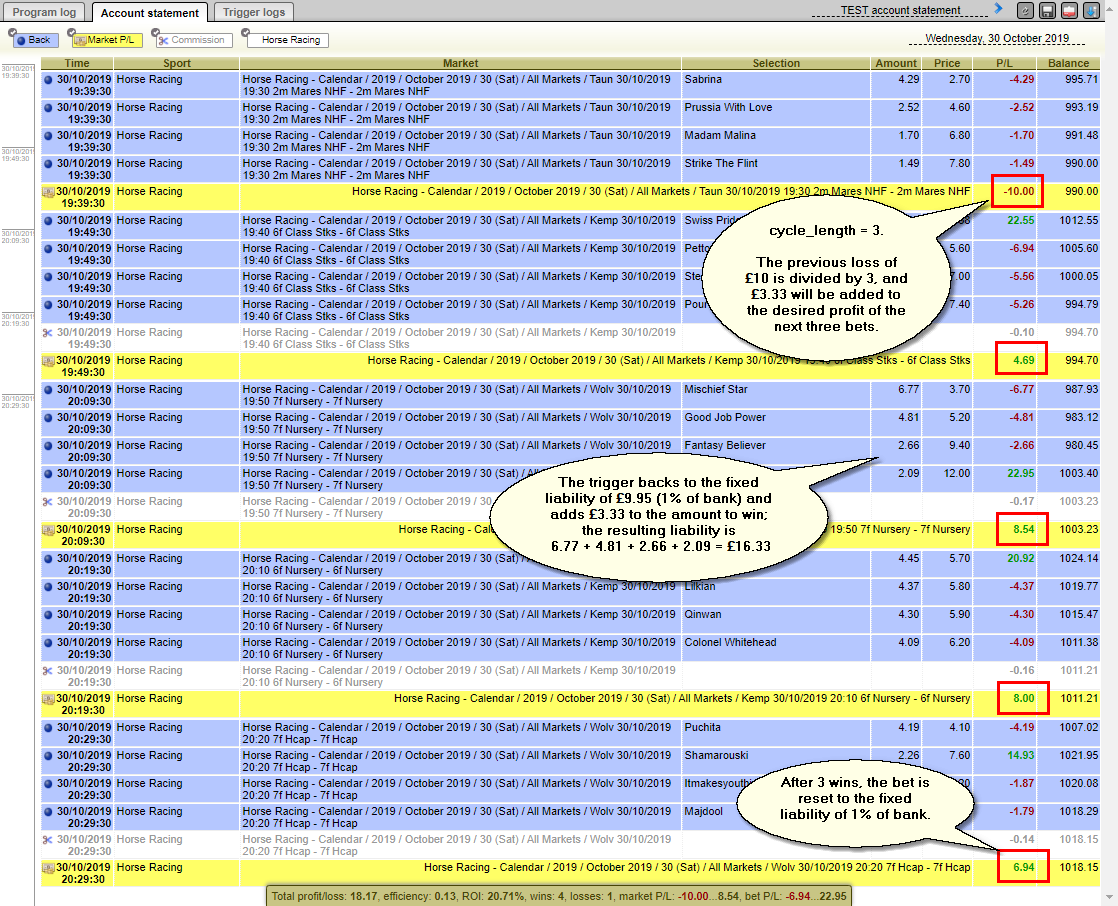 The triggers start by backing to a fixed liability (in the example, it is 1% of the bank). After the first loss, the amount of loss is divided by cycle_length, and that portion is added to the desired profit of the next set of bets. Thus the liability of your bets in the next market will be increased. At the end of the cycle, the bet will be reset to the fixed liability. If another loss happens before the loss recovery has been completed, that loss is also added to the remaining loss amount, and the sum is again divided by cycle_length. The loss recovery then starts anew.